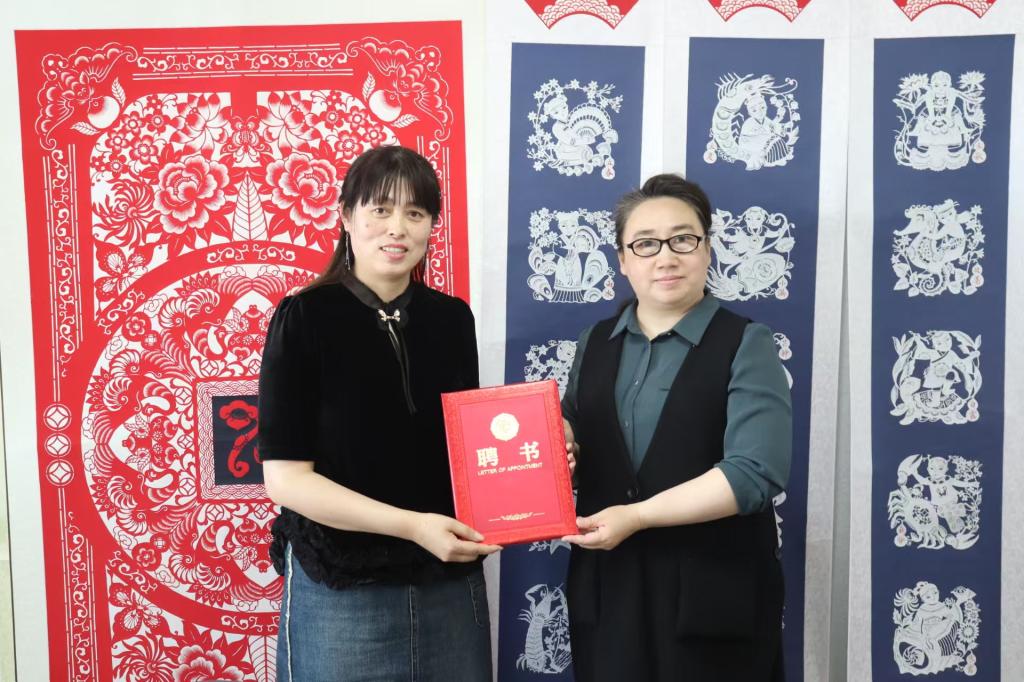 院徽剪纸赠情谊,薪火相传聘名师。精彩的剪纸体验活动后,举行了简朴而有意义的捐赠与聘任仪式。为支持学院文化建设,薛娜老师将精心创作的MG冰球突破官网院徽主题剪纸作品赠予学院。该作品尺寸达 120*120,巧妙地将传统剪纸艺术与学院特色融合,极具艺术价值与纪念意义。甘露露代表学院接受捐赠,并向薛娜老师致以诚挚谢意。随后,甘露露为薛娜老师颁发聘书,聘请其为学院“非遗文化传承导师”。甘露露在致辞中表示,此次聘任标志着学院与非遗传承人深度合作的良好开端,下一步,学院将定期邀请薛娜老师走进校园,开展系列非遗剪纸文化体验活动,引导青年学子在动手实践中体味非遗之美,感悟匠心之韵,真正做到“以美化人,寓教于乐”,让传统文化在青年群体中生根发芽。