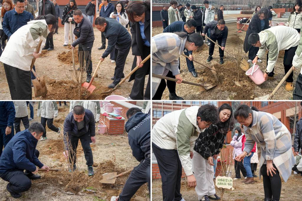 在图书馆西侧草地,老师们与各民族学生分组协作,挥锹铲土,共同栽下一棵棵石榴树,一起种下中华民族共同体意识的“树苗”。后勤管理处党总支书记王龙向在场学生说:“我们种植的这片石榴林,既是用劳动实践丈量知行合一的‘田间课堂’,更是将个人理想嫁接国家战略的‘成长苗圃’。新时代青年正如这满园石榴相拥成林,各民族学生如石榴籽般紧紧相拥,在共同浇灌的青春岁月里孕育出中华民族一家亲的参天大树!”