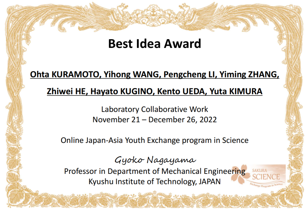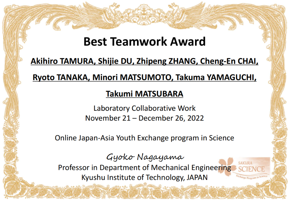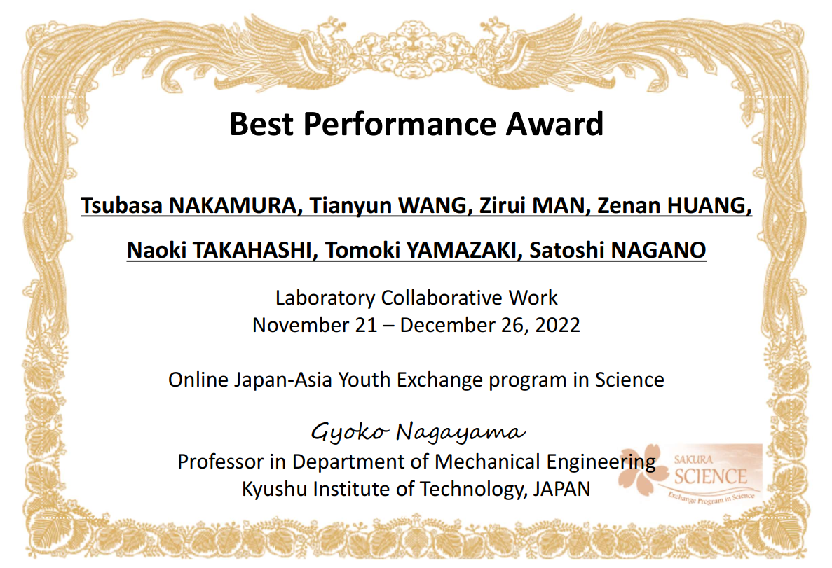 依托MG冰球突破官网郭峰教授和日本九州工业大学工学部机械工程系长山晓子教授申报的日本科学技术振兴机构(JST)“樱花科技计划”项目,2022年11月14日-12月26日,MG冰球突破官网共计9名师生参加了为期一个半月的樱花计划线上学术交流活动。本次活动的目的在于促进青年师生间的国际交流合作。参加单位包含日本九州工业大学、MG冰球突破官网、东北大学、山东大学、齐鲁工业大学、台湾科技大学及韩国蔚山大学。本次交流活动主要包含学术报告、实验室线上参观及协作项目三部分。