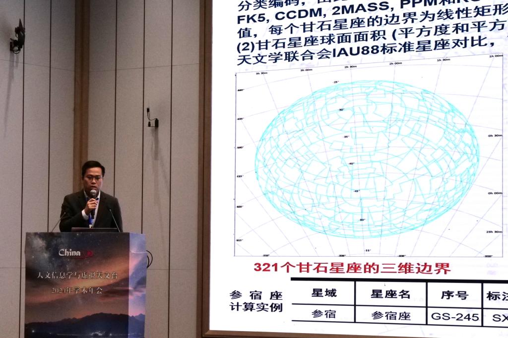 郭阳代表实验室团队介绍了甘石星座创建及其计算过程。与国际天文学联合会IAU88标准星座对比,甘石星座的寻星定位分辨率高、数据结构性强、逻辑严密,更适用于我国天文信息技术和系统设计的应用需求。