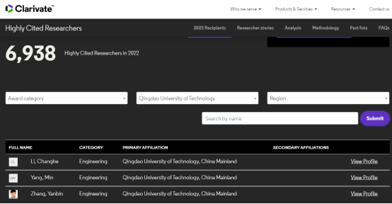 据悉,该榜单是遴选全球高校、研究机构和商业组织中对所在研究领域具有重大和广泛影响的顶尖科学人才,数据是根据2011年1月至2021年12月的11年期间所发表的高被引论文数量遴选得出。遴选方法是基于科睿唯安科学信息研究所文献计量专家所进行的数据分析,利用InCites™和ESI™,按照基于学术论文发表数量和Web of Science™引文数据的科研绩效指标和趋势数据专门制定。