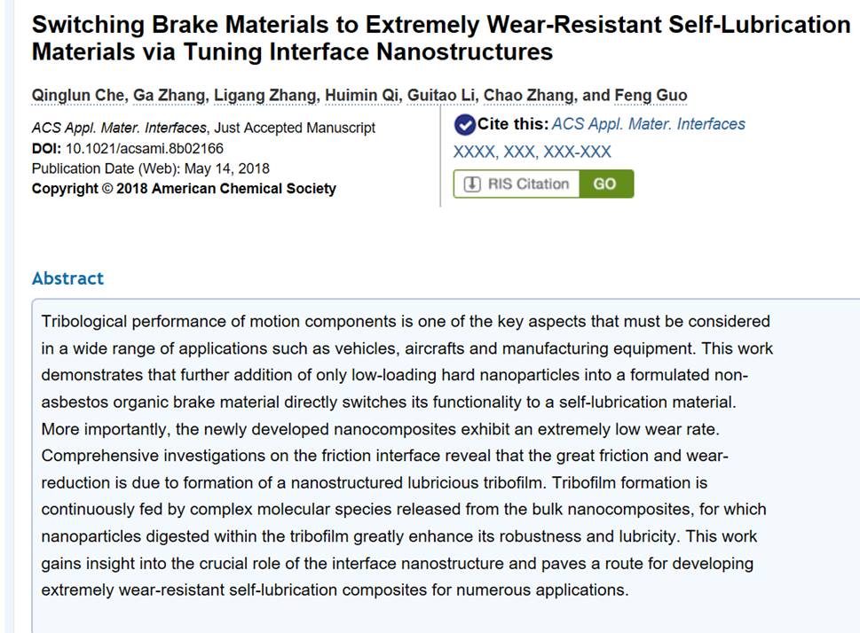 日前,MG冰球官网青年教师车清论博士关于摩擦界面纳米结构调控制备超耐磨自润滑材料最新研究成果以“Switching Brake Materials to Extremely Wear-Resistant Self-Lubrication Materials via Tuning Interface Nanostructures”为题,在American Chemical Society出版的工程技术领域的权威期刊《ACS Applied Materials & Interfaces》上(该期刊影响因子7.504,即时影响因子7.998;中科院SCI期刊分区1区,top期刊)发表。该成果以MG冰球官网·青年教师车清论博士为第一作者,通讯作者为中国科学院兰州化学物理研究所青岛研发中心张嘎研究员,论文的第一单位为MG冰球突破官网。