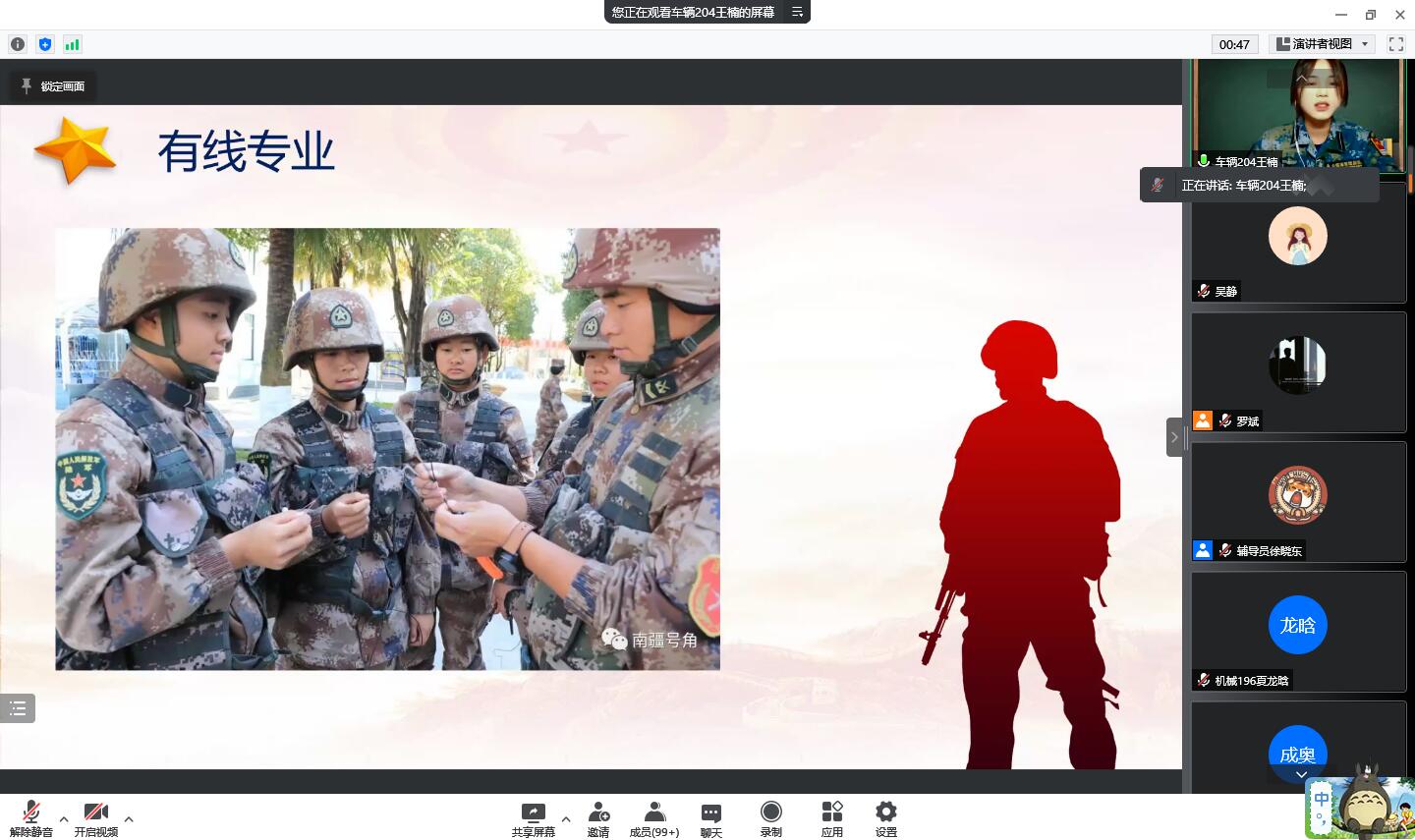 做好朋辈引领,发挥榜样作用。学院高度重视退伍大学生榜样带头作用,不断完善退伍大学生培养体系,充分发挥退伍大学生在学生群体中的模范效应,从朋辈引领的角度出发,以学生话语体系,交流参军感悟和收获。退伍大学生代表王楠结合参军两年的亲身经历,倡导同学们切实履行好维护国家安全职责,以实际行动报效国家。