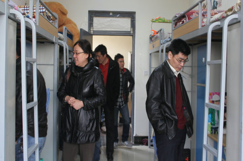 为以优异成绩迎接省教育厅专家组对学生公寓检查验收,贯彻落实学校关于开展宿舍安全卫生综合治理的通知精神,3月28日上午,机械学院党总支书记薛炜华、副书记李国涛带领各年级辅导员和部分班主任对学院嘉陵江路校区学生宿舍进行了检查指导。