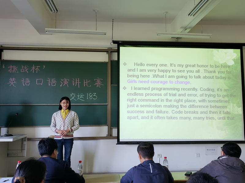 为营造班级英语学习气氛,丰富班级活动。10月24日下午,MG冰球突破官网交运183班在主教学楼B432教室举行“挑战杯”英语口语演讲比赛。