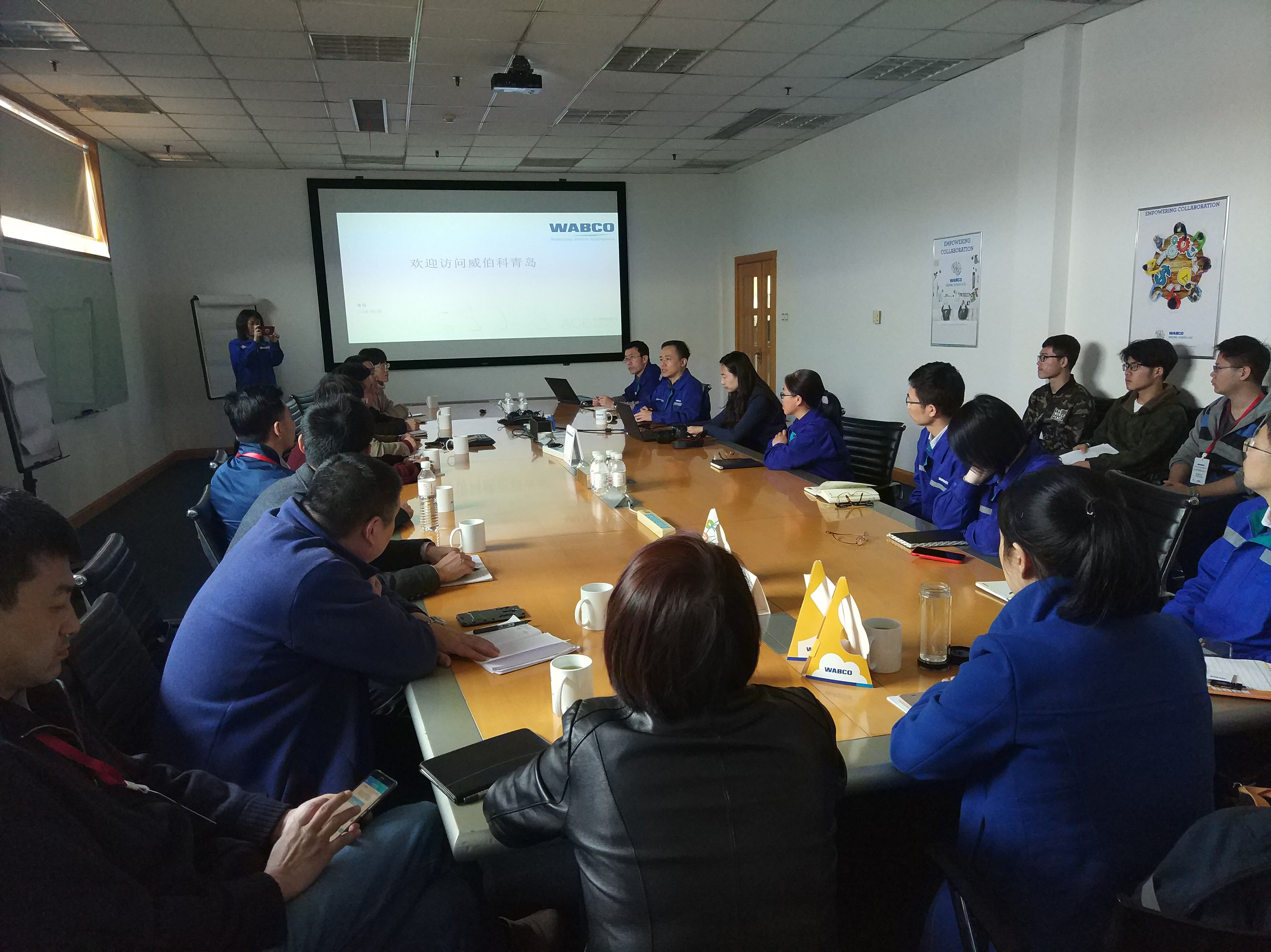 在威伯科汽车控制系统(中国)有限公司一号会议室,公司总经理王继才对机车学院老师的到来表示热烈的欢迎和期盼,希望与MG冰球官网进行长久的产学研合作。学院副院长杨勇教授表示自机车学院与威伯科签订校企合作后,学院立刻行动,切实将合作体现在行动上来。经前期沟通,这期带13位老师本着学习和解决企业难题的目的来企业交流,希望与威佰科的产学研能落到实处。随后王继才向大家介绍了公司的基本情况,威伯科汽车控制系统(中国)有限公司是由威伯科集团于2004年8月在中国青岛注册并投资1600万美元成立的亚太区独资的制造基地,是商用车电子制动、稳定性、悬挂和传动控制系统方面世界领先的供应商之一。公司期待在机械手在产线效率提升方面的应用、消音器测试、视觉检测稳定性(除噪)提升研究、能源回收及管控与MG冰球官网开展合作研发。随后机车学院刘志红博士向大家做了《汽车消音器声学性能测试评价》的学术报告。