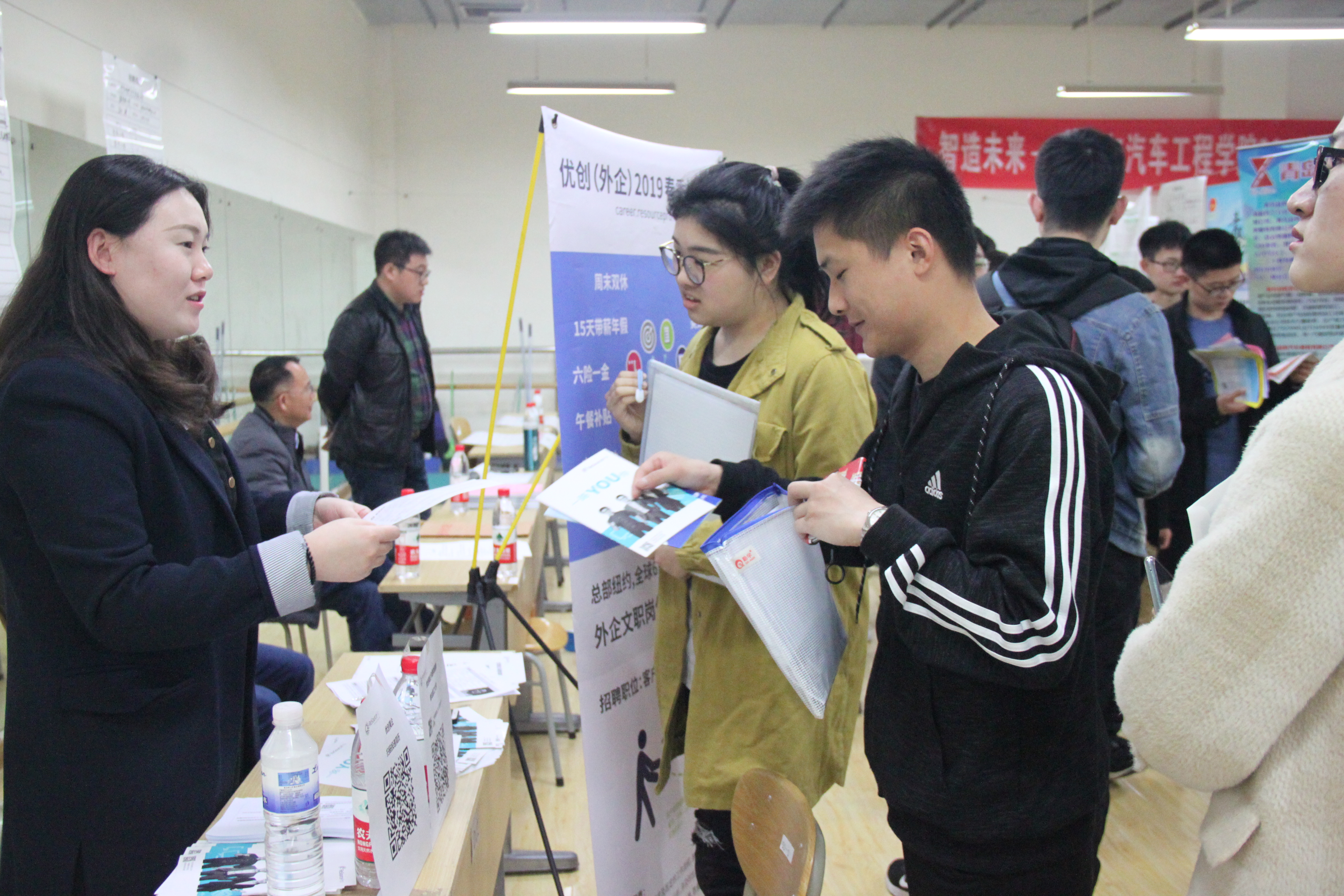 4月13日,MG冰球突破官网主办的2019届毕业生就业双选会在嘉陵江路校区体育场教室成功举办,此次双选会以“智造未来”为主题,共邀请65家企业参会,提供各类岗位400余个,覆盖机械、电气、交通、安全等多个专业相关岗位,60余人现场达成实习、就业意向。党委常委、副校长沈文青到场指导,并就人才培养、学生就业等问题同参会企业进行深入交流。学生工作处副处长鞠志强、学院学生工作干部全程参与组织本次双选会。