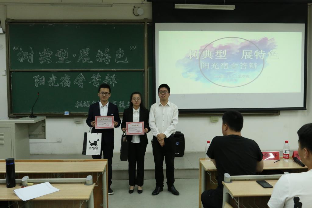 会议开始,殷宗华提出宿舍文化建设是校风学风建设的重要内容,对学生人生观的形成、综合素质的培养有着重要的影响,希望同学们能在本次活动中充分展示本宿舍的特色和风采。本次答辩活动共有15个宿舍参与,答辩人员以PPT的形式分别从宿舍概况、宿舍学风、宿舍卫生、宿舍获奖等方面展示本宿舍风采,部分宿舍还辅以视频、音乐,充分展现丰富多彩、团结和谐的宿舍生活,在整个答辩过程中,答辩的同学举止大方、陈述流利,精彩表现使答辩现场高潮迭起,在全面展示宿舍建设成果的同时,也得到了现场师生的一致好评。最后,殷宗华对本次活动作总结,他表示宿舍之间应该交流互鉴,携手共进,创建保持良好的舍风。经过综合评定,最终获得一等奖的宿舍为4#522、9#535,获得二等奖的宿舍为6#319、4#629、4#713,获得三等奖的宿舍有6#310、4#720、9#621、6#211。其中4#522、9#535被评为学风优胜宿舍;6#319 被评为文艺优胜宿舍;6#211、9#621等宿舍被评为体育优胜宿舍;4#720、6#310 被评为科创优胜宿舍;4#713、4#629 被评为卫生优胜宿舍。