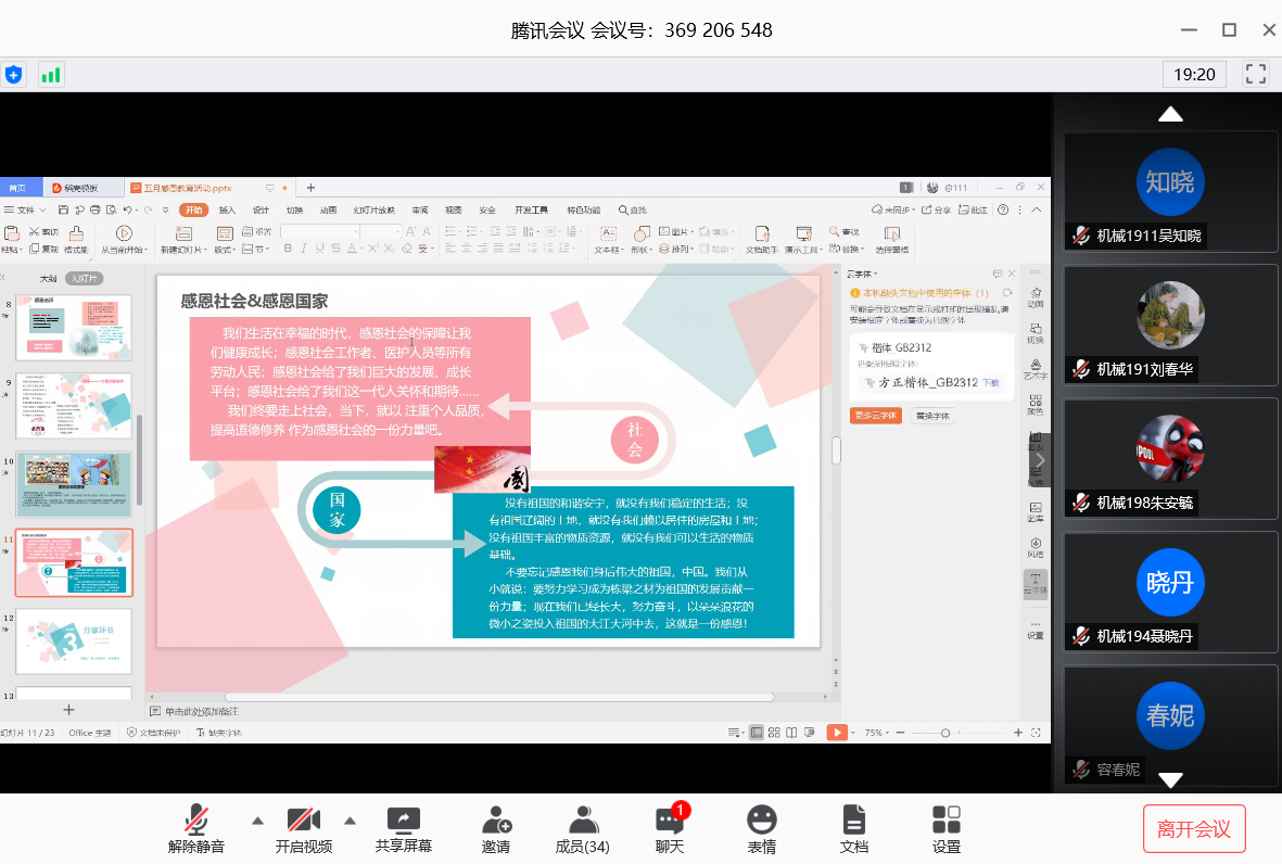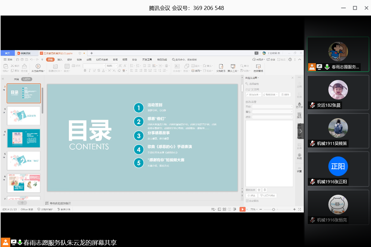 春雨志愿服务队以“云课堂”的方式开展“感恩”主题宣讲活动。活动由春雨志愿服务队成员、馨心手语社社长担任宣讲人,从什么是感恩,感恩的意义和方式是什么等方面让我们对感恩有了进一步的了解,在宣讲中馨心手语社社长,教授大家简单的手语词“感恩的心”,并且为同学们带来精彩的手语表演。在宣讲中,我们呼吁同学们在生活中要懂得感恩,学会感恩,一起为社会做出力所能及之事。