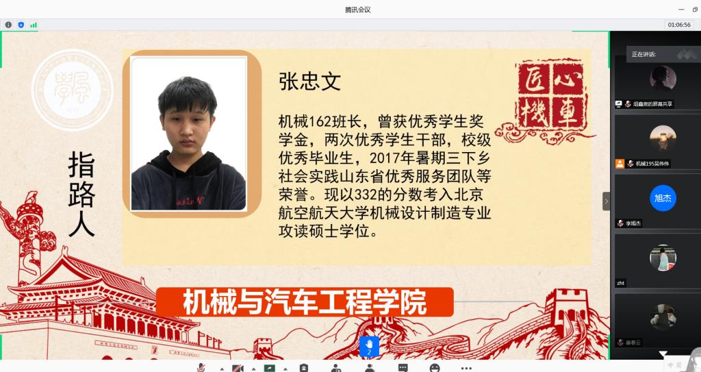 为进一步加强学院学风建设,提高广大同学的考研积极性和备考自信心,7月7日晚,MG冰球突破官网第31期匠心机车讲坛—“考研之路漫漫,前辈出招指南”在线上开展。本次交流会邀请了王鑫雨(山东大学研究生在读)、闫彩莲(东北大学)、张忠文(北京航空航天大学)和王俊博(山东大学)四位优秀的学长学姐进行线上交流分享,200余名学生参加此次交流会。