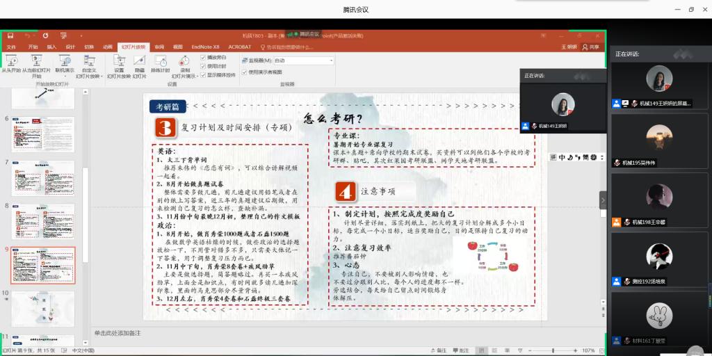 交流会上,四位“指路人”通过讲述他们考研之路的经历和相关经验,给在校学生传授学习的方法和技巧,并进行答疑解惑。正在哈尔滨工业大学硕博连读的邢旭东梳理了大学不同阶段的主要任务和大学四年应该达到的目标,针对具体学科介绍了学习方法和技巧,并就研究生的生活状态同广大在校生进行交流。正在东北大学研二就读的王妍妍勉励广大在校生要“从容自信,坚定自励;规划之要,贵在有恒;慎重选择,勇往直前。”就读于山东大学材料科学与工程学院的丁慧莹讲述了她备考的时间线和不同时间段的具体规划,让同学们以此为参考制定更清晰的计划。就读于北京工业大学交通运输专业的刘英苗则鼓励同学们多参加各类学科竞赛和专业竞赛,培养兴趣、锻炼能力,还教给了大家收集信息的方法、具体学习计划的制定以及备考注意事项等。答疑环节中,同学们踊跃参与,各位校友就在校生提出的问题进行了耐心细致的解答。