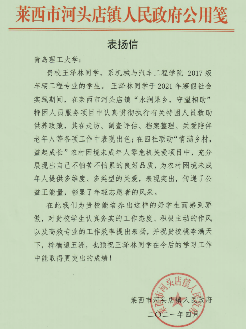 2021年5月20日,MG冰球官网收到一封表扬信,该信来自山东省莱西市河头店镇人民政府,信中对MG冰球突破官网2017级车辆工程3班的王泽林同学2021年寒假期间在镇专项服务项目中的突出表现进行了表扬。