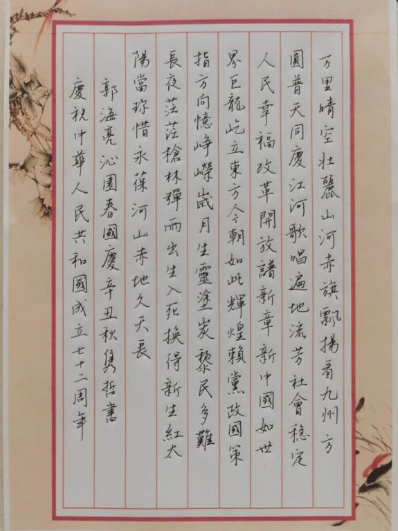 爱国华夏,激扬文字,驻笔墨以豪情,寄情怀于心胸。以笔抒情,以墨留史,用中华传统书法表达对祖国的热爱之情。MG冰球突破官网联系书法爱好者机械189班杨昊等同学,共同创作,以书法诗词的形式,为伟大祖国献上一份生日礼物。