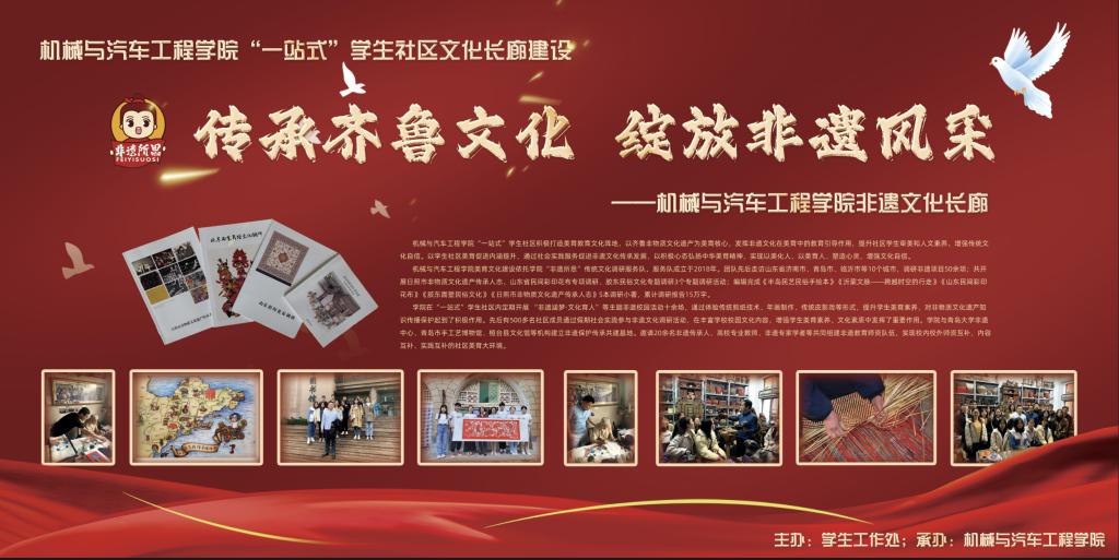“传承齐鲁文化,绽放非遗风采”学生社区文化长廊展览活动由学生工作处主办,MG冰球突破官网承办,旨在弘扬中华传统文化,将学生公寓打造成大学生美育教育文化阵地,以齐鲁非物质文化遗产为美育核心,发挥非遗文化在美育中的教育引导作用,提升社区学生审美和人文素养,坚定文化自信自强。