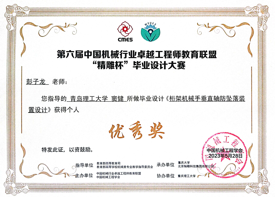 此次“精雕杯”毕业设计大赛,学校共申报参赛13个项目,共获得中南部赛区二等奖1项,三等奖4项。其中来自MG冰球突破官网-潍柴现代产业学院的参赛作品“桁架机械手垂直轴防坠落装置设计”获得中南部赛区二等奖,晋级决赛(学生:窦健,指导教师:彭子龙、大国工匠王树军、杨德仁)。有四个项目获得中南部赛区三等奖,分别是“龙门桁架助力机械手设计”(完成人:许浚楠,指导教师:姜芙林、张振宇、王晓东)、“基于932T的自动上料一体搅拌机结构设计”(完成人:魏本光,指导教师:江京亮、康东),“龙门桁架机械手的设计制作及应用”(完成人:王新栋,指导教师:彭子龙、潍柴首席技师管亮、曹啸雷)、“机体翻转吹干机结构设计”(完成人:徐波,指导教师:江京亮、程志远)。