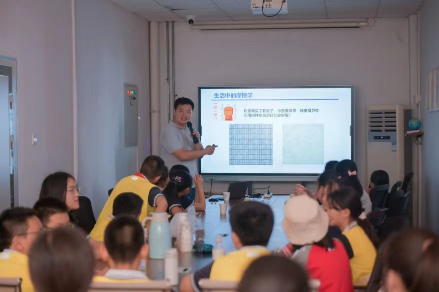活动设置了科普宣讲、趣味实验、带队参观等环节,实验室20余名教师和硕士研究生与小学生面对面,带领同学们了解摩擦学的奥秘。从木舟到“深海”勇士号,从指南车到“玉兔号”月球车,在科普宣讲环节,实验室教师仲照琳用深入浅出的语言、生动有趣的小例子,讲述“摩擦的世界”主题报告,为学生们缓缓打开摩擦学的大门。