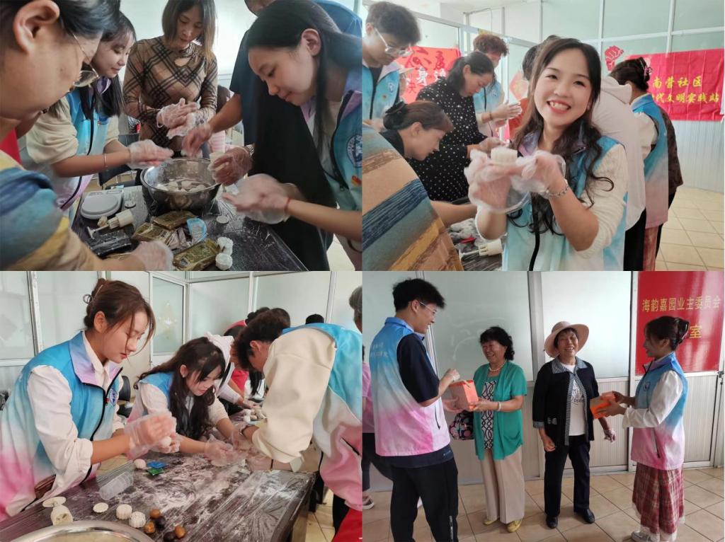 迎中秋话幸福,体验传统文化。南营社区志愿者刘阿姨向学生们介绍了中秋节的由来、当地习俗,并围绕“祭月”“拜月”“赏月”“追月”以及“吃月饼”等传统习俗进行分享,同学们为社区居民们解析古诗《十五夜望月》和《望月怀远》等。在月饼制作环节,在社区阿姨的悉心指导下,学生们纷纷化身成月饼制作师傅,戴起手套,按部就班制作起来,揉搓糯米团、包馅料、撒糯米粉、按压成型……一气呵成,一块寓意着团圆的冰皮月饼就出炉了。每个人从开始的小心翼翼互相观望,到后来的驾轻就熟、得心应手,在一片欢声笑语中,一枚枚精美可爱的冰皮月饼逐渐成型,浓郁的香味弥漫在整个活动室,大家将做好的月饼放进精美的包装盒中,送到居民手中。居民们开心地和学生拉起了家常,“中秋佳节,吃到年轻人亲手做的月饼,心里也是暖暖的,欢迎你们常来社区,常回家看看。”