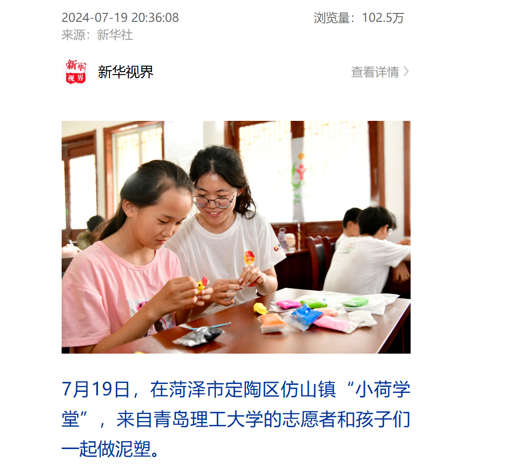 7月19日,MG冰球突破官网蒲公英志愿服务协会和彩虹堂志愿服务协会赴菏泽“小荷学堂”开展暑期关爱留守儿童支教活动被新华社进行报道。