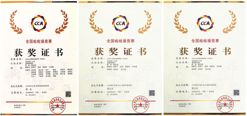 2025年全国啦啦操联赛(青岛站)近日于莱西市圆满收官。作为全国性啦啦操品牌赛事,本次联赛于9月26日至27日持续举办,吸引了70余支队伍、近千名运动员参赛,设置公开青年、公开儿童等多个组别,涵盖花球、街舞、技巧、爵士等多个啦啦操项目,采用国际啦啦操联合会最新竞赛规则评分,对选手的技术难度、艺术表现及团队配合提出极高要求,赛事专业性与影响力备受业界认可。在此番全国性赛事舞台上,邓鸿尹、孙宁涵两位同学再次展现强劲实力,不仅携手夺得公开青年乙组双人花球自选动作第五名,更与团队协作拿下公开青年乙组集体花球自选动作第一名。
