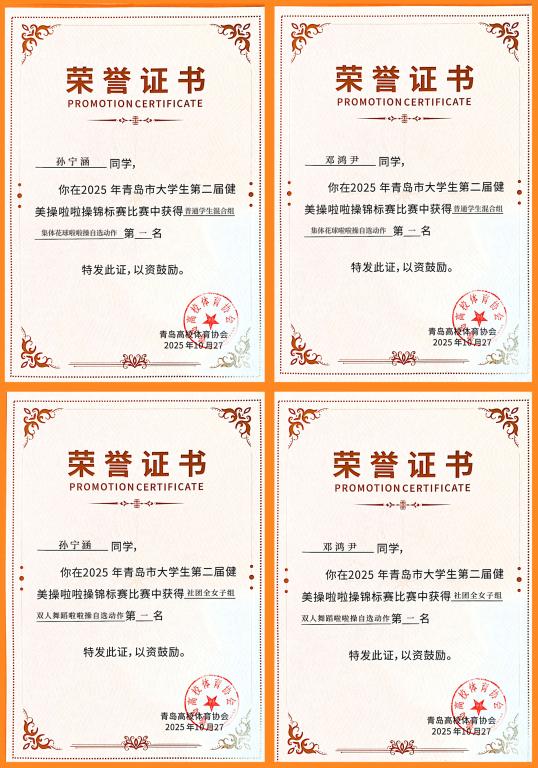 近日,MG冰球突破官网邓鸿尹、孙宁涵两位同学及所在团队捷报频传,先后在青岛市第二届健美操啦啦操锦标赛与2025年全国啦啦操联赛(青岛站)中表现突出,凭借扎实的技术功底与出色的团队协作,斩获多项荣誉,为校争光。