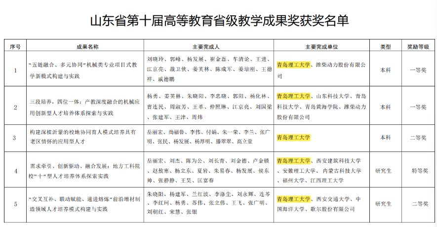 在山东省第十届高等教育省级教学成果奖评选中,学院教师在本科与研究生教育领域共取得五项奖项。其中,本科教育方面,刘晓玲等老师完成的《“五链融合、多元协同”机械类专业项目式教学新模式构建与实践》荣获一等奖;杨勇等老师完成的《三段培养,四位一体:产教深度融合的机械应用创新型人才培养体系探索与实践》荣获一等奖;岳丽宏等老师完成的《构建深植沂蒙的校地协同育人模式培养具有老区情怀的应用型人才》荣获二等奖。研究生教育方面,岳丽宏等老师完成的《需求牵引、创新驱动、融合发展:地方工科院校“十”型人才培养体系探索实践》荣获特等奖;朱晓阳等老师完成的《“交叉互补、联动赋能、递进熔炼”前沿增材制造领域人才培养模式构建与实践》荣获二等奖。这些成果集中体现了学院在产教融合、项目式教学、协同育人、跨学科培养等方面的深入探索与实践成效。