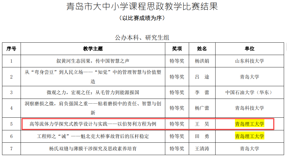 在青岛市大中小学课程思政教学比赛中,学院王昊老师凭借《高等流体力学探究式教学设计与实践——以伯努利方程为例》作品,荣获公办本科、研究生组特等奖。这一成绩展现了学院教师在课程思政融入专业教学、实现价值引领与知识传授相统一方面的扎实能力与创新实践。