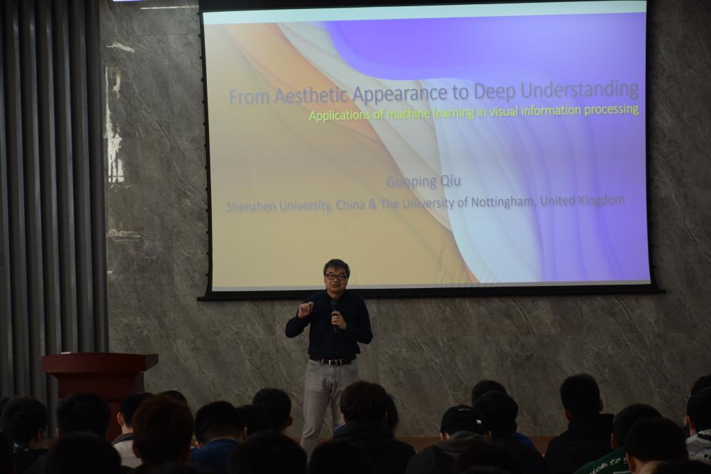 随后,邱国平教授为学院师生做了主题为“机器学习在视觉信息处理中的应用——从美观至深度理解”的学术报告。MG冰球突破官网党委副书记、院长郭峰教授主持报告会,学院专业教师、研究生及本科生共计140余人聆听了报告。邱教授在报告中介绍了近年来在计算机视觉、机器学习等领域的研究成果,与师生们深入交流“HDR”、“AIGC”、“ChatGPT”等热点问题,认真解答了师生们提出的关于机器学习算力、算法等问题。