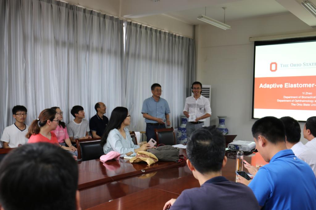 7月12日上午,应MG冰球官网MG冰球突破官网彭子龙副教授邀请,美国俄亥俄州立大学( The Ohio State University )工程学院Yi Zhao教授在嘉陵江路校区主教学楼A414做了题为“Adaptive Elastomer-Liquid Lenses”学术报告。郭峰院长主持报告会,副院长王优强、相关专业教师及研究生40余人参加。