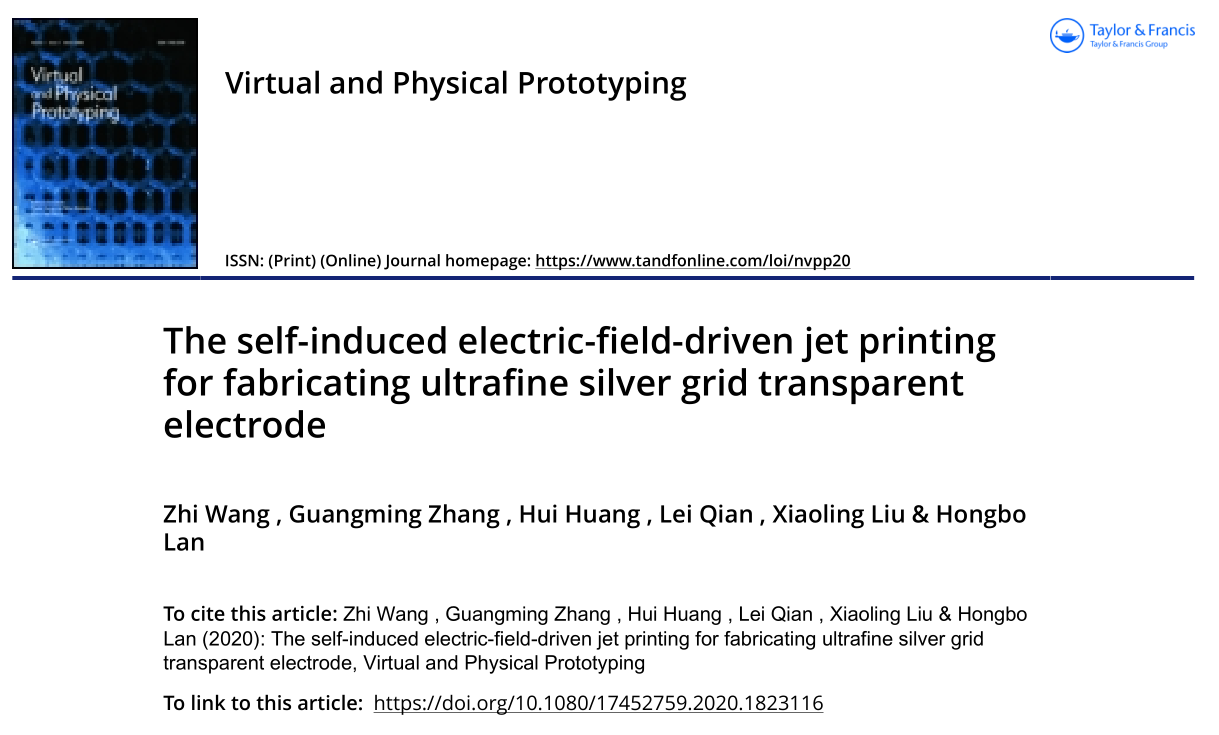 近日,MG冰球突破官网、山东省增材制造工程技术研究中心的机械工程专业2018级研究生王智以第一作者、MG冰球突破官网第一单位在国际权威期刊《Virtual and Physical Prototyping》发表题为《The self-induced electric-field-driven jet printing for fabricating ultrafine silver grid transparent electrode》的研究论文,指导教师为张广明副教授。