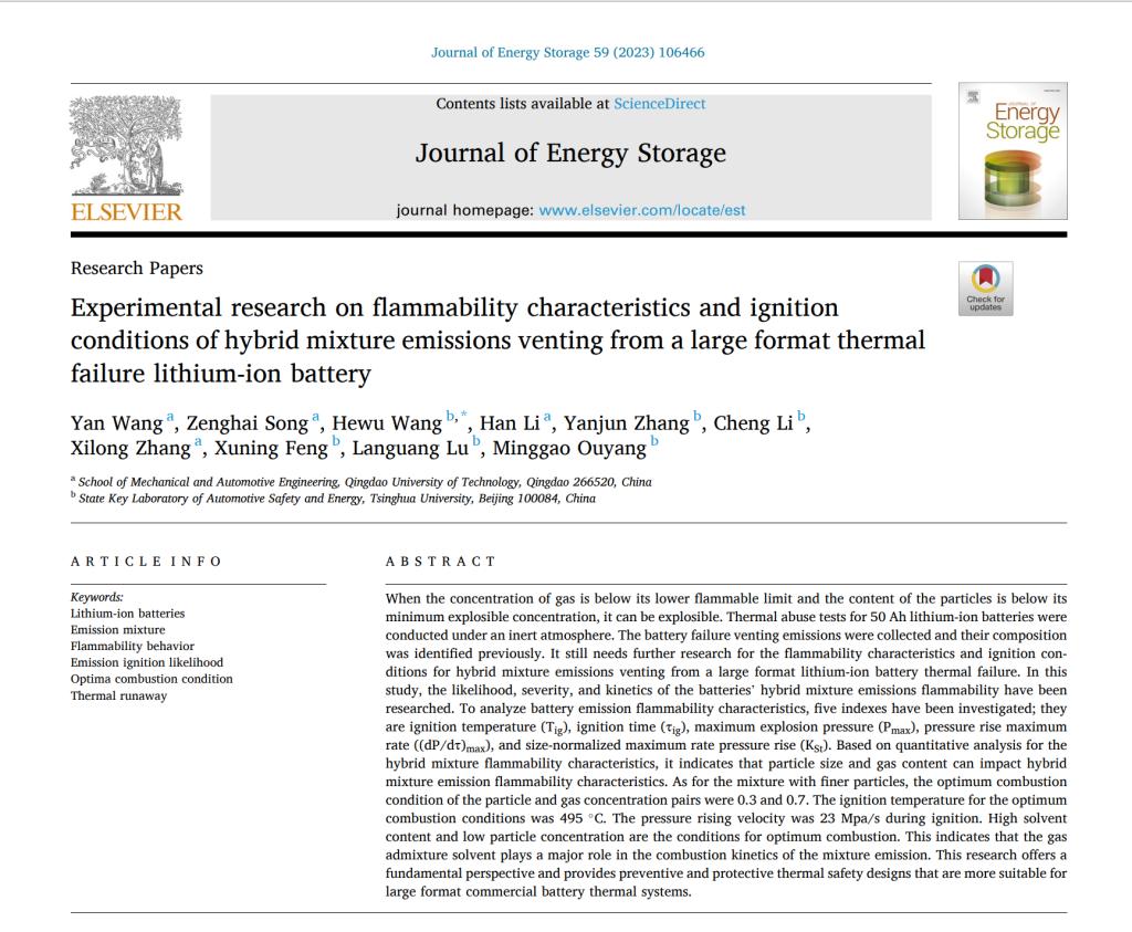 近日,MG冰球突破官网青年教师王炎副教授与其硕士研究生宋增海在高比能锂离子动力电池失效释放物气固混合相着火性能及其引燃边界方面取得阶段性研究进展,在权威期刊《Journal of Energy Storage》(IF=8.907,JCR Q1)上发表了题为“Experimental research on flammability characteristics and ignition conditions of hybrid mixture emissions venting from a large format thermal failure lithium-ion battery ”的研究论文。该研究成果系MG冰球突破官网教师与清华大学欧阳明高院士电池安全课题组联合研究重要成果,MG冰球突破官网机械与汽车学院为第一署名通讯单位,第一作者为王炎副教授,通讯作者为清华大学车辆与运载学院王贺武研究员。